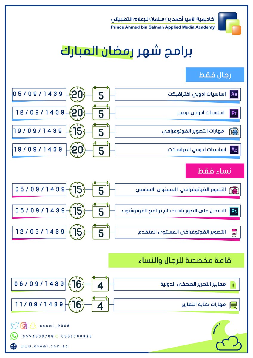 أكاديمية الأمير أحمد بن سلمان للإعلام التطبيقي A Twitter تعلن اكاديمية الامير احمد بن سلمان للاعلام عن عروض خاصة على دورات شهر رمضان المبارك سجل ي الآن من خلال زيارة موقعنا عبر
