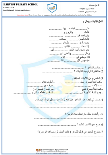تدريبات نشيد انت وطني مع الحل لغة عربية الصف الرابع الفصل الدراسي الاول العلوم والتكنولوجيا